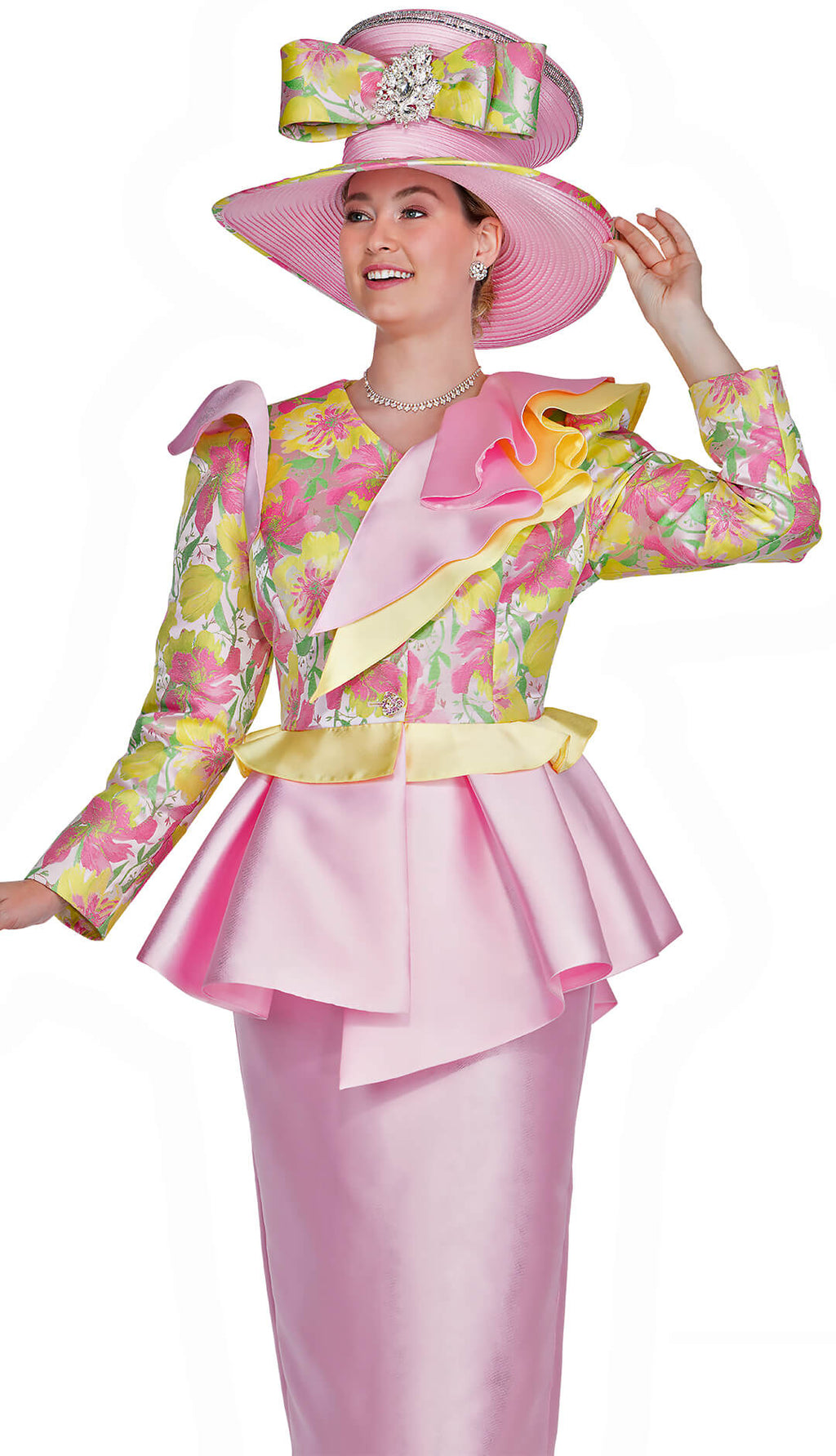 Elevate your style with our Champagne Italy Church Suit 6011. This stunning skirt suit features a feminine flower print peplum jacket, ruffle shoulder detail, and elegant rhinestone buttons. Available in sizes 8-26, in a beautiful pink color that will make you stand out. Perfect for any special occasion.