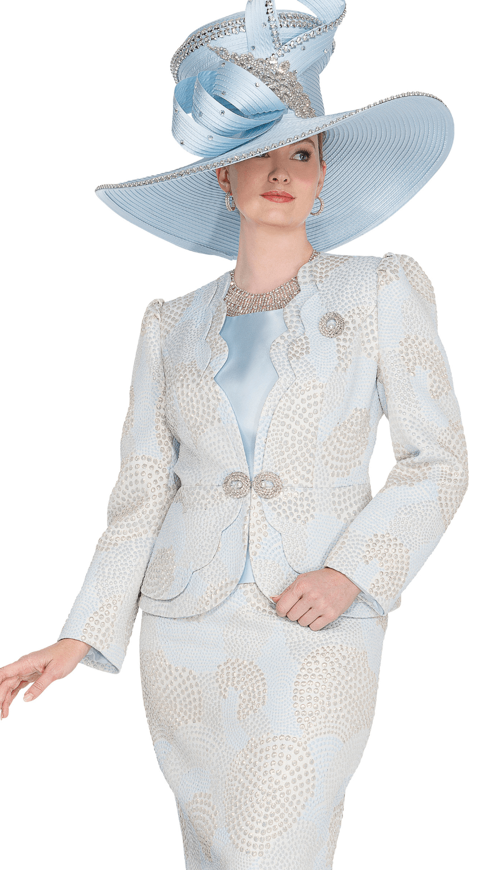 The Champagne Italy Church Suit 6212 is a sophisticated and stylish three piece skirt suit, perfect for any formal occasion. The circular pattern and scallop neckline add a touch of elegance, while the rhinestone brooch adds a touch of glamour. Available in light blue and gold, and a range of sizes, this suit is sure to make you stand out in a crowd.