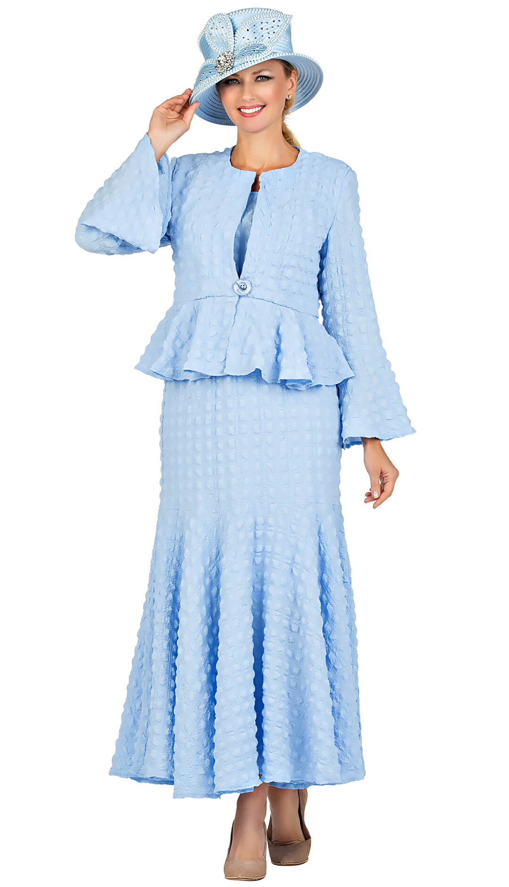 Look sharp in the Giovanna 0943B- church suit. Crafted from machine-washable popcorn fabric, it features a maxi mermaid skirt with peplum jacket and cami. The blue coloring offers a classic and timeless look. A beautiful suit from Giovanna for your next special occasion.