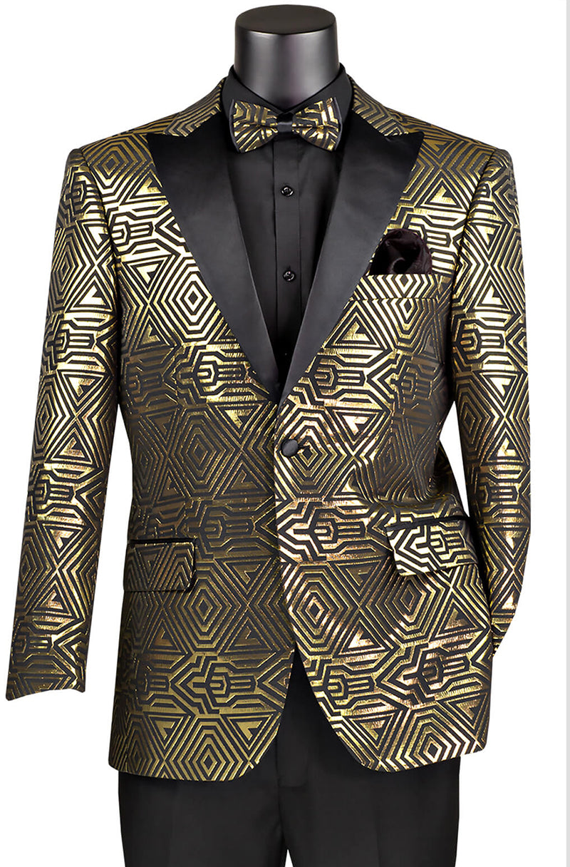 Introducing the Vinci Sport Jacket BM-4 Gold. This modern fit blazer features a sleek metallic pattern, peak lapels, and a single button closure. With flap pockets and a matching bow tie included, this jacket is both stylish and functional. Stand out at special events and prom with this elegant gold color.