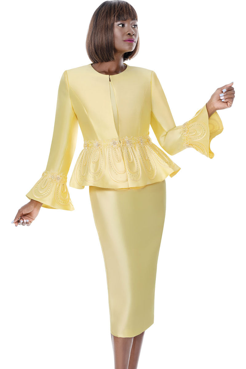 Elevate your church and wedding wardrobe with this sophisticated three-piece skirt suit from Terramina. Designed with refined tailoring and timeless elegance, this ensemble features a coordinated jacket, skirt, and complementary piece that work seamlessly together. The yellow hue brings warmth and grace to any formal occasion, while the quality construction ensures a polished appearance that commands respect. Perfect for services, celebrations, and special events where you want to look your absolute best. This is the kind of suit that becomes a trusted staple in your collection—versatile enough to mix and match with other pieces, yet complete enough to wear as a stunning coordinated set.